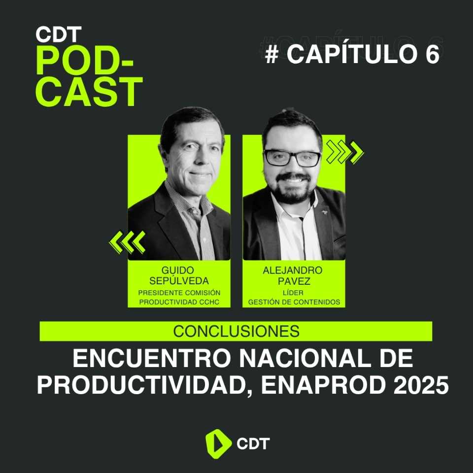 CDT Podcast arranca su temporada 2025 analizando las principales conclusiones y desafíos que dejó el Encuentro Nacional de Productividad, ENAPROD 2025, realizado en junio pasado en la región de La Araucanía. Para ello, Alejandro Pavez, Líder de Gestión de Contenidos de la CDT y conductor del espacio, conversa con Guido Sepúlveda, presidente de la Comisión de Productividad de la Cámara Chilena de la Construcción, quien destaca la importante convocatoria que tuvo el encuentro.