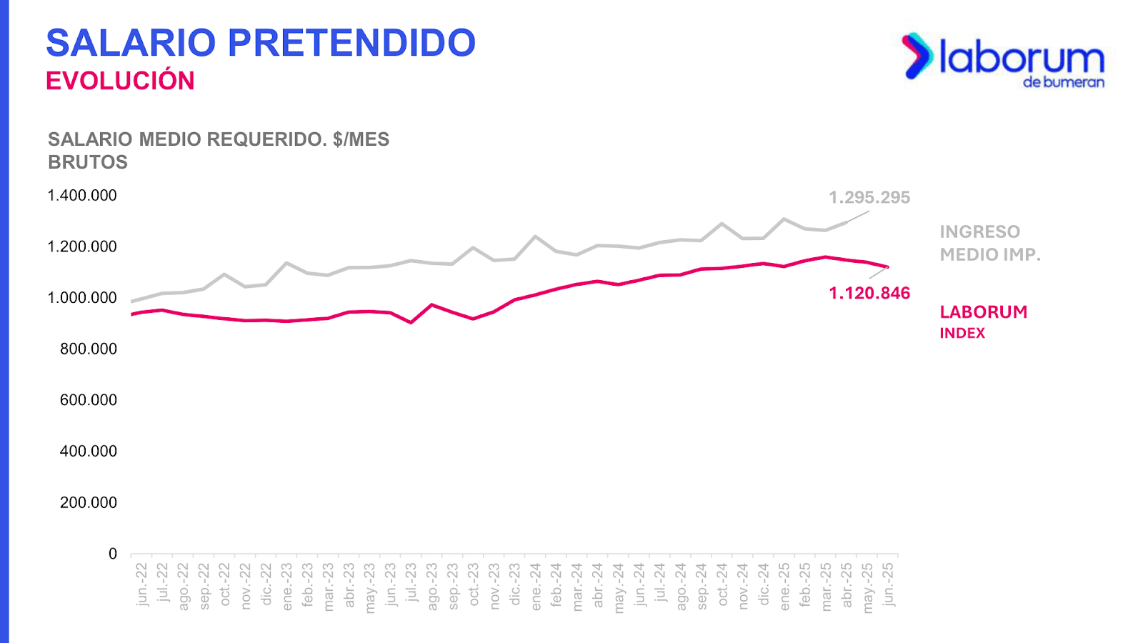 La remuneración pretendida promedio llegó a $1.120.846 en junio, con una disminución del 1,2% respecto a mayo. Pese a los incrementos durante marzo y abril, la remuneración pretendida ha ido a la baja: en enero, fue de $1.122.518; en febrero de $1.145.131; en marzo de $1.160.180; en abril de $1.148.517; y, en mayo de $1.139.579.