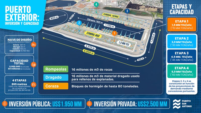 El Puerto Exterior de San Antonio constituye la obra de infraestructura más relevante para el comercio exterior de Chile en el siglo XXI y responde a una Política de Estado sostenida para asegurar que el país cuente con instalaciones portuarias de última generación, con la capacidad necesaria para atender el amplio flujo de naves y los diversos tipos de carga, e integrada eficientemente con el sistema logístico. Con una inversión estimada en torno a los USD 4.450 millones, el proyecto Puerto Exterior aportará una nueva capacidad de 6 millones de TEU anuales, lo que permitirá triplicar el volumen actual y elevar la capacidad total del complejo portuario de San Antonio hasta los 8,5 millones de TEU, permitiendo la atención simultánea de múltiples naves de gran envergadura clase Post-New-Panamax.