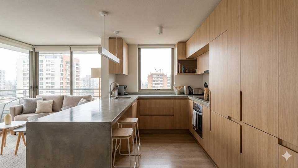 Una de las señales más claras del mercado chileno es la reducción del metraje disponible. Los departamentos nuevos privilegian cocinas abiertas o semiabiertas que se conectan directamente con el estar, por lo que el diseño debe resolver estética y funcionalidad en un mismo movimiento. Las barras cumplen el doble rol de mesa de trabajo y superficie social, lo que ordena visualmente el espacio.