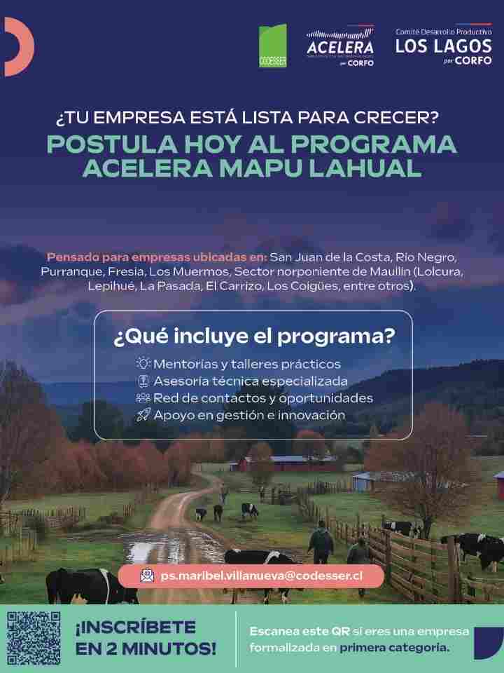 El programa Acelera Mapu Lahual, impulsado por Corfo Los Lagos y ejecutado por Codesser, inicia una gira territorial que contempla reuniones informativas presenciales en cada una de las comunas donde está enfocado: San Juan de la Costa, Río Negro, Purranque, Fresia, Los Muermos y zona norponiente de Maullín, con el objetivo de acercar la información directamente a las empresas locales, explicar en detalle el programa y resolver dudas sobre el proceso de postulación.
